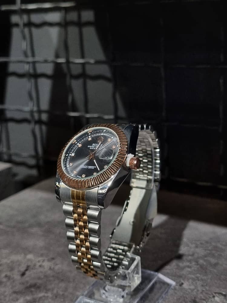 درباره ساعت فلزی برند ROLEX رنگ نقره ای طلایی /صفحه مشکی