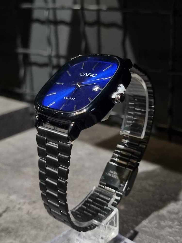 درباره ساعت فلزی CASIO صفحه مربعی رنگ مشکی/صفحه آبی