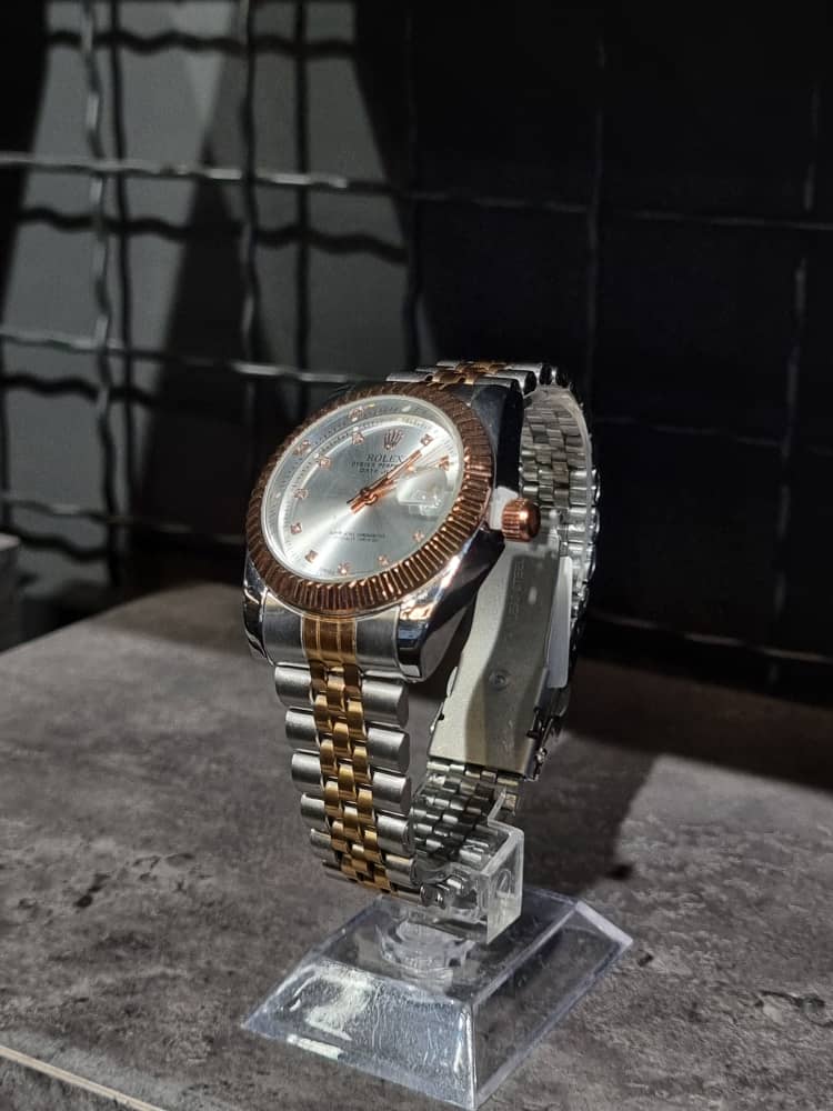 درباره ساعت فلزی برند ROLEX رنگ نقره ای طلایی/صفحه نقره ای